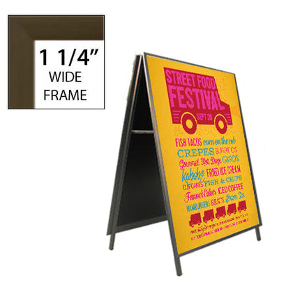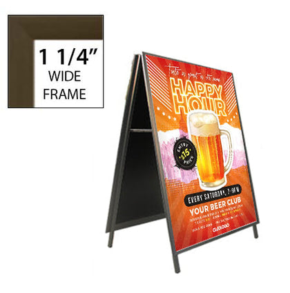 Make a bold impression with a 2 1/2" wide A-frame poster holder. These wide frames help call attention to your advertisement in an eye-catching way. Make your graphic stand out when you choose from a black, silver, gold, or faux cherrywood frame finish. No matter your choice, the wide frame will keep the spotlight on your display.