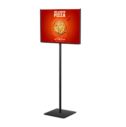 This Countertop Pedestal Display Stand is lightweight and has an 18" fixed steel post. It's designed with a single-sided display frame that can accommodate 11 x 17 signs, graphics, posters, and various types of signage. The metal sign holder frame can hold graphics with a thickness of up to 1/16 inch. Additionally, you can choose the frame in either portrait or landscape orientation to suit your specific needs.