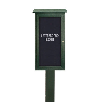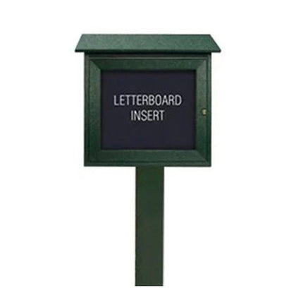 The High-Density, Eco-Friendly Polyethylene construction of this exterior letter board gives it advantage over other tradition wood outdoor message centers i.e. our 16x34 Letter Board will never Crack, Split or Rot from the Weather. In addition to protection from the weather, the enclosed letter board features a Front CAM Lock and a Break-Resistant Acrylic Window fixed to a Top-Positioned Hinge. This deters possible tampering and vandalism while the exterior notice board is installed in your outdoor location. You can also order our 16x34 Changeable Plastic Letter Board with a Single Leg Post. The Post attaches to the bottom of the outdoor letter board through a pre-drilled hole. The Leg Post then firmly roots your outdoor information board 3 ft. in-ground.