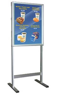 The popular 22x28 poster graphic size is widely used in 2-sided sidewalk signs and can be found standing in front of parking lots, car washes, drive-in fast food franchises, cafes, and other sites with significant foot and street traffic.