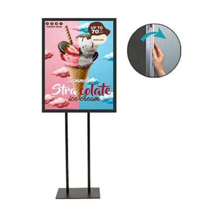 Enhance your floor-standing 24x36 sign holder with 8 colorful snap frame finishes and double-pole display stand finishes in either Black or Silver, designed to complement a wide range of interior decors. With its portable design, you can easily lift and move the stand to your desired floor location.