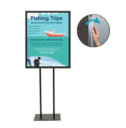 Choose one 24x36 frame for single-sided viewing or two snap frames for double-sided viewing when ordering your poster stand.