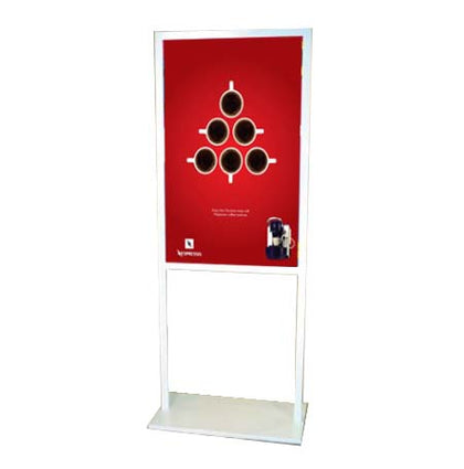 With two posts and a portrait-size, two-sided sign frame of 22x28, this stand offers the flexibility to display either two separate posters or a single double-sided poster, making it a versatile signage solution for various settings and applications. The unique bottom-loading frame design makes it quick and easy to change your printed graphic materials up to 3/8 inch thick.