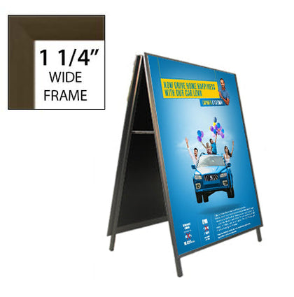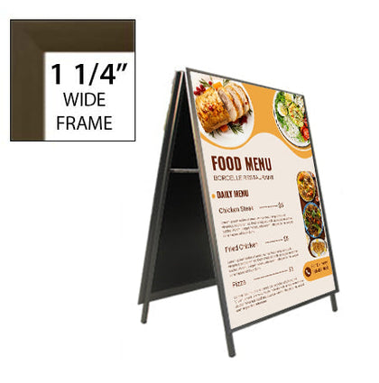 Extra Large AFrame display stand finishes come in either in Black or Silver. To compliment wide-ranging interior decors, choose from 8 colorful snap frame finishes. Portable and easy to store, the 27" x 39" A Frame Floor Sign Holder Stand easily folds to place onto your desired floor location.