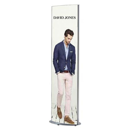 The modern contemporary look is perfect for lighted quick change graphics, with double sided viewing! Dramatic, stylish, elegant two-sided illuminated curved design is on full display for this Totem Floorstand.